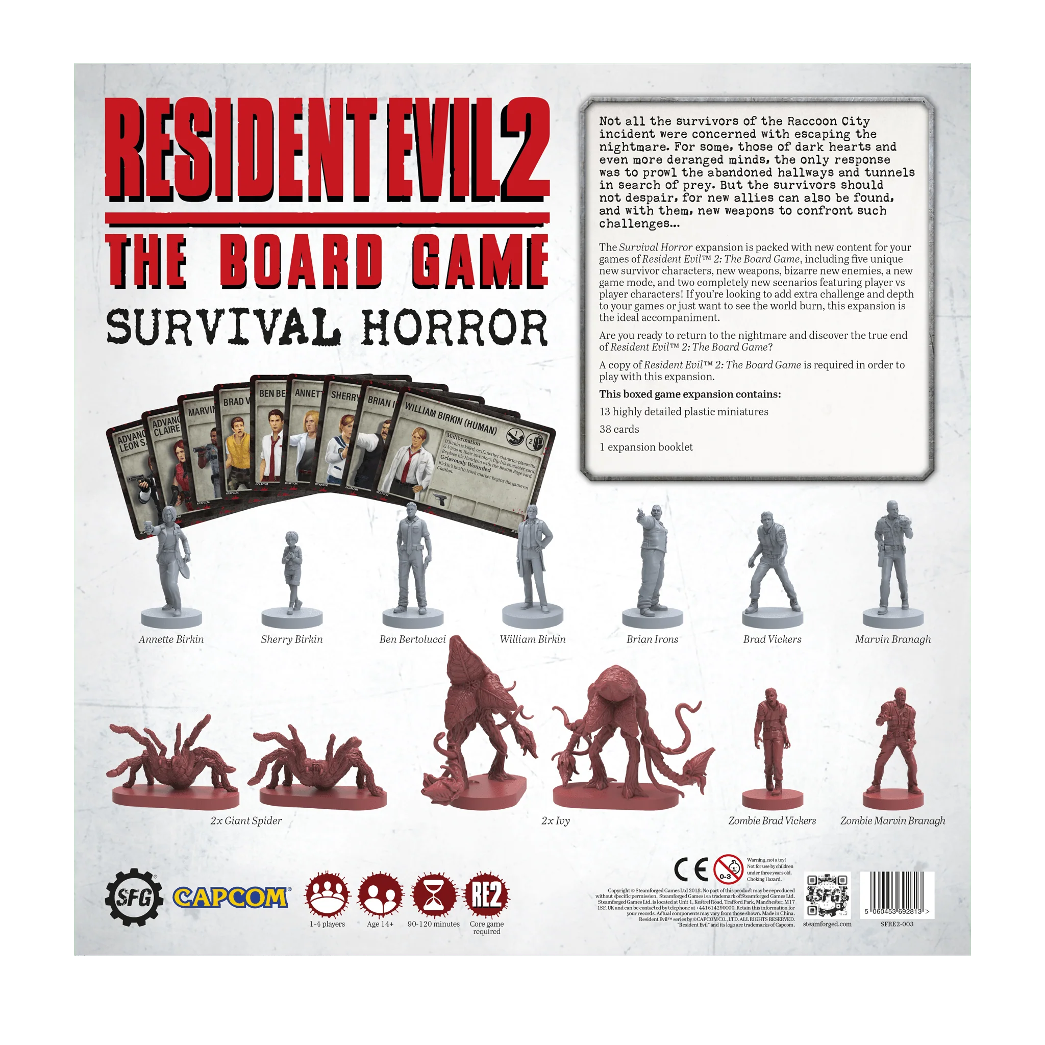The Survival Horror Expansion is packed with new content for Resident Evil⢠2: The Board Gameāincluding five unique new survivor characters, advanced versions of two characters from the core game, new weapons, bizarre new enemies, a new game mode, and two completely new scenarios featuring player vs player characters!